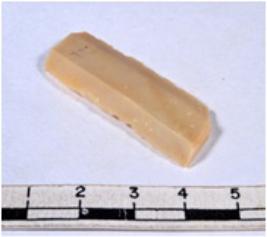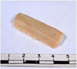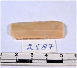 | Description / विवरण | A fragment of a rectangular shaped chert blade showing parallel sides with sharp edges having smooth surface and uneven section. |