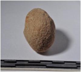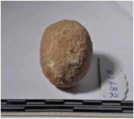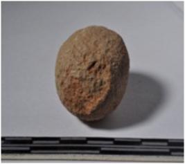 | Description / विवरण | A terracotta sling ball round in shape of smooth surface. |