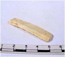| Description / विवरण | A fragment of a rectangular shaped chert blade showing parallel sides with sharp edges having smooth surface and triangular section. |