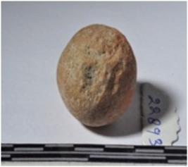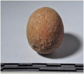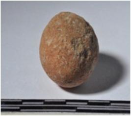 | Description / विवरण | A terracotta sling ball round in shape of smooth surface. |