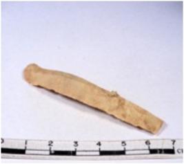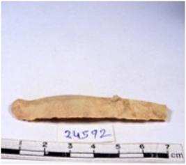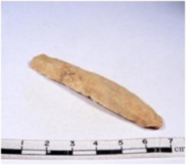 | Description / विवरण | A fragment of a rectangular shaped chert blade showing dorsal sides with sharp cutting edges having smooth surface and triangular section. |