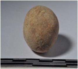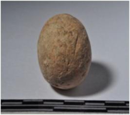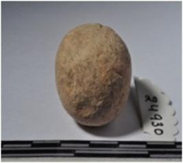 | Description / विवरण | A terracotta sling ball, round in shaped and rough surface. |