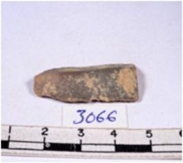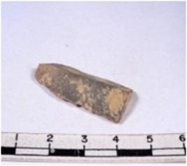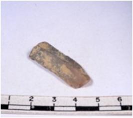 | Description / विवरण | A fragment of a rectangular shaped chert blade showing dorsal sides with sharp cutting edges having smooth surface and triangular section. |