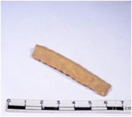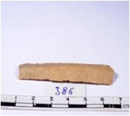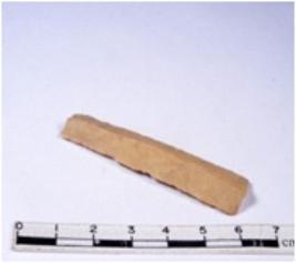 | Description / विवरण | A fragment of a rectangular shaped chert blade shownig dorsal sids with sharp cutting edges having smooth surface and triangular section. |