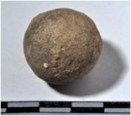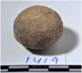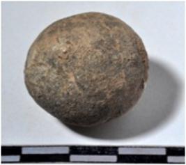 | Description / विवरण | A terracotta sling ball round in shape of rough surface. |