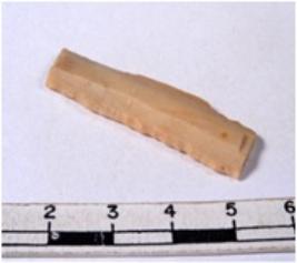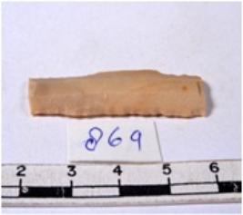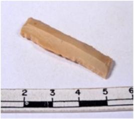 | Description / विवरण | A fragment of a rectangular shaped chert blade showing dorsal sides with sharp cutting edges having smooth surface and triangular section. |