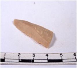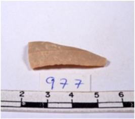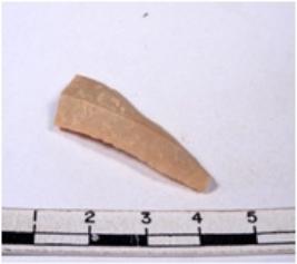 | Description / विवरण | A fragment of a rectangular shaped chert blade showing dorsal sides with sharp edges having smooth surface and triangular section. |