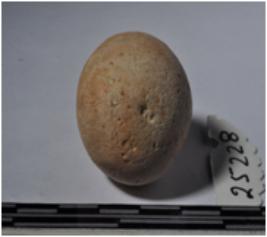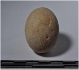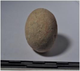 | Description / विवरण | A terracotta sling ball, round in shaped and rough surface. |