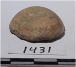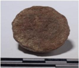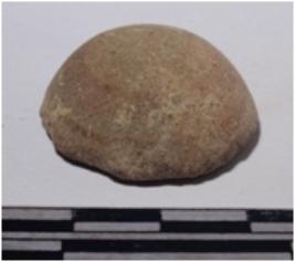 | Description / विवरण | A fragment of a red sand stone sling ball, smooth surface. |