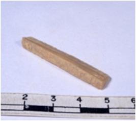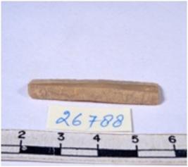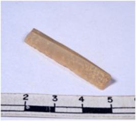| Description / विवरण | A fragment of a rectangular shaped chert blade showing dorsal sides with sharp cutting edges having smooth surface and triangular section. |