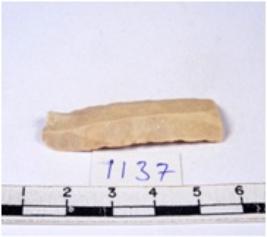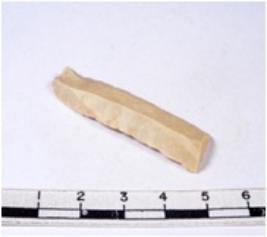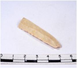 | Description / विवरण | A fragment of a rectangular shaped chert blade showing dorsal sides with sharp edges having smooth surface and triangular section. |