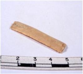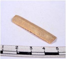 | Description / विवरण | A fragment of a rectangular shaped chert blade showing dorsal sides with sharp cutting edges having smooth surface and triangular section. |