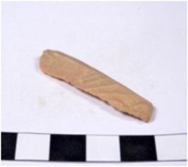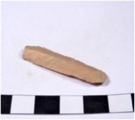 | Description / विवरण | A fragment of a rectangular shaped chert blade showing dorsal sides with sharp cutting edges having smooth surface and triangular section. |