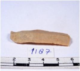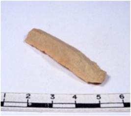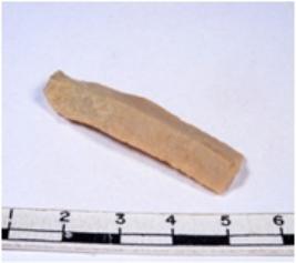 | Description / विवरण | A fragment of a rectangular shaped chert blade showing dorsal sides with sharp cutting edges having smooth surface and triangular section. |