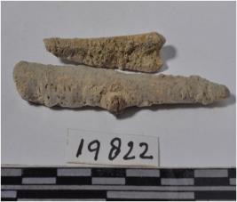 | Description / विवरण | A fragment of a bone point, pointed at one side, and rough surface. |