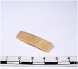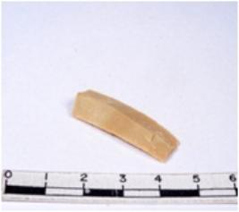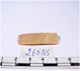 | Description / विवरण | A fragment of a rectangular shaped chert blade showing dorsal sides with sharp cutting edges having smooth surface and triangular section. |
