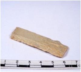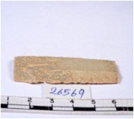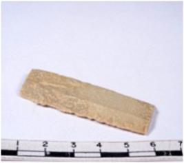 | Description / विवरण | A fragment of a rectangular shaped chert blade showing parallel sides with sharp edges having smooth surface and uneven section. |