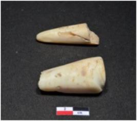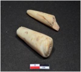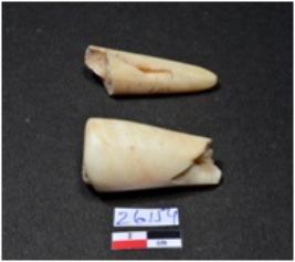 | Description / विवरण | Two standard sized of shell point showing conical in shaped, pointed on one end, broken both ends, having glossy surface. |