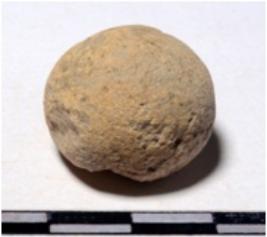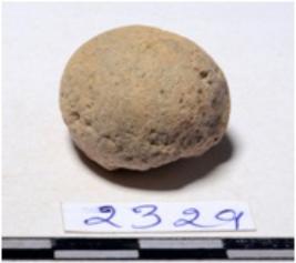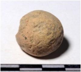 | Description / विवरण | A fragment of a terracotta sling ball round in shape of rough surface. |