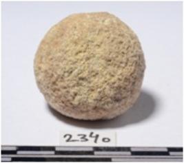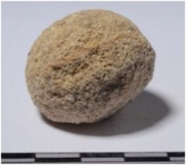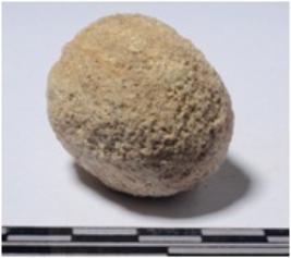 | Description / विवरण | A stone sling ball round in shape, slightly partly broken of rough surface. |