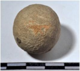 | Description / विवरण | A terracotta sling ball, round in shape of rough surface. |
