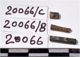| Description / विवरण | A fragment of a stone drill bit, both ends broken, circular in section of smooth surface. |