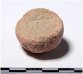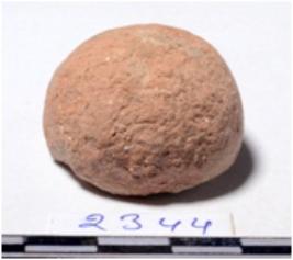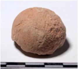 | Description / विवरण | A fragment of a terracotta sling ball round in shape of rough surface. |
