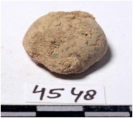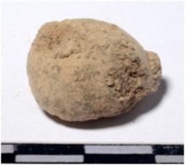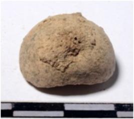 | Description / विवरण | A fragment of a terracotta sling ball circular in shape of rough surface. |