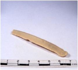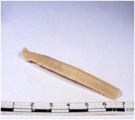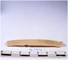 | Description / विवरण | A fragment of a rectangular shaped chert blade showing dorsal sides with sharp cutting edges having smooth surface and triangular section. |