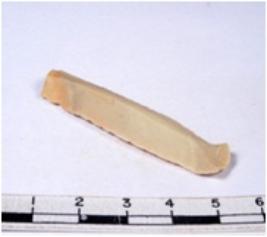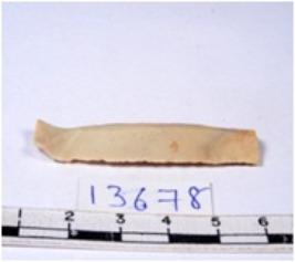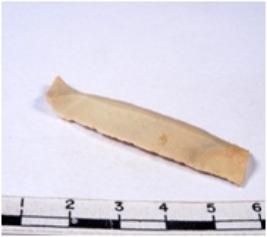 | Description / विवरण | A fragment of a rectangular shaped chert blade showing dorsal sides with sharp edges having smooth surface and triangular section. |