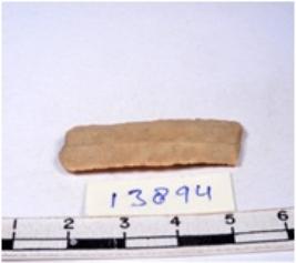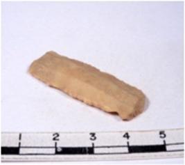 | Description / विवरण | A fragment of a rectangular shaped chert blade showing dorsal sides with sharp edges having smooth surface and triangular section. |