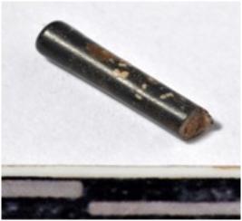 | Description / विवरण | A fragment of a stone drill bit, circular in section, broken from both ends of rough surface. |