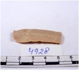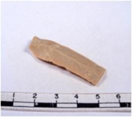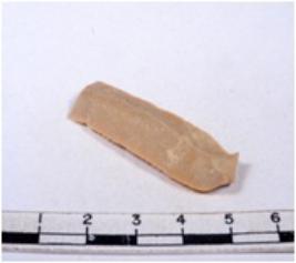| Description / विवरण | A fragment of a rectangular shaped chert blade showing dorsal sides with sharp cutting edges having smooth surface and triangular section. |