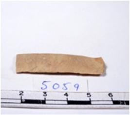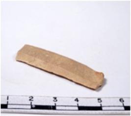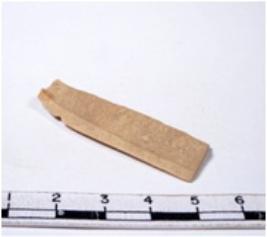 | Description / विवरण | A fragment of a rectangular shaped chert blade showing dorsal sides with shaped edges having smooth surface and triangular section. |