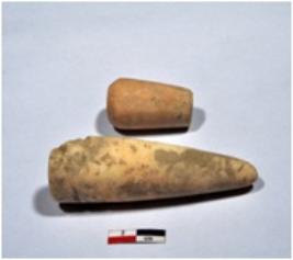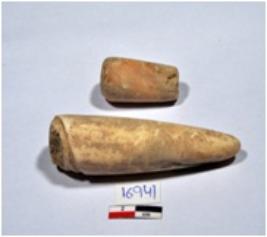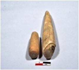 | Description / विवरण | 1 A long sized shell point, conical in shaped, pointed on one end, broken from upper part, having fine surface. 2 A standard sized shell point cylindrical in shaped, from both end, having rough surface. |