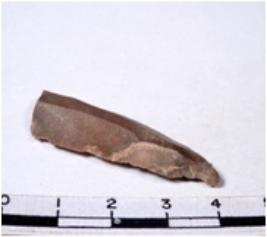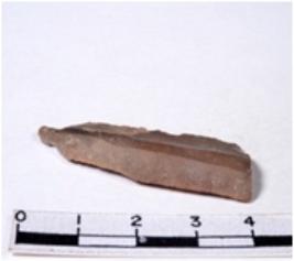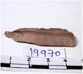 | Description / विवरण | A fragment of a oval shaped chert blade showing dorsal sides with sharp cutting edges having smooth surface and triangular section. |