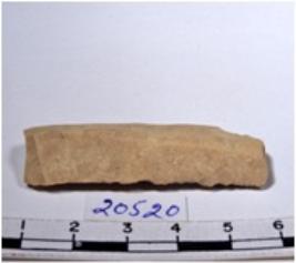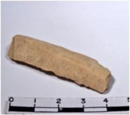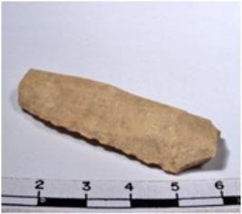 | Description / विवरण | A fragment of a rectangular shaped chert blade showing dorsal sides with sharp cutting edges having smooth surface and triangular section. |
