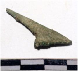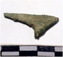 | Description / विवरण | A fragment of a copper arrow head, pointed end of rough surface. |
