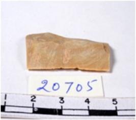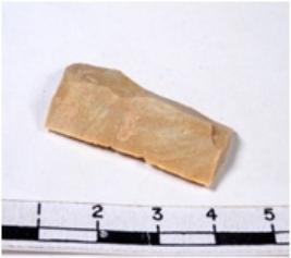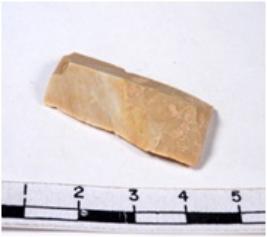 | Description / विवरण | A fragment of a rectangular shaped chert blade showing dorsal sides with sharp cutting edges having smooth surface and triangular section. |