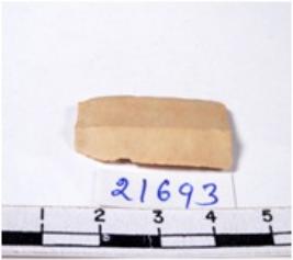 | Description / विवरण | A fragment of a rectangular shaped chert blade showing flat sides with sharp edges having smooth surface and triangular section. |