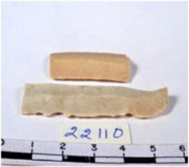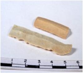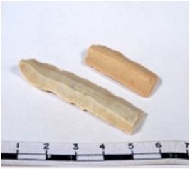 | Description / विवरण | A fragment of a rectangular shaped chert blade showing dorsal sides with sharp cutting edges having smooth surface and triangular section. |