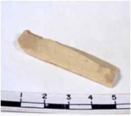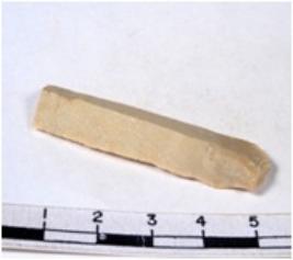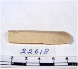 | Description / विवरण | A fragment of a rectangular shaped chert blade showing dorsal sides with sharp cutting edges having smooth surface and triangular section. |