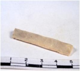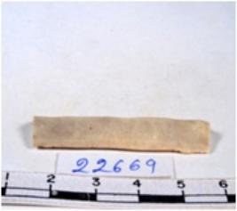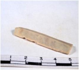 | Description / विवरण | A fragment of a rectangular shaped chert blade showing dorsal sides with sharp cutting edges having smooth surface and triangular section. |