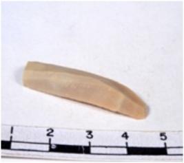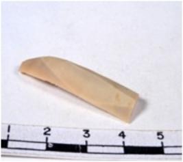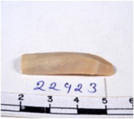 | Description / विवरण | A fragment of a rectangular shaped chert blade showing dorsal sides with sharp edges having smooth surface and uneven section. |