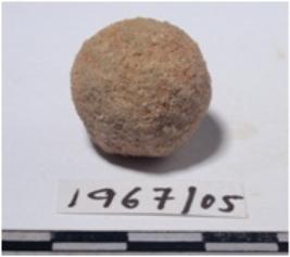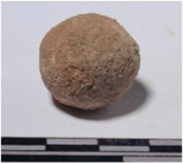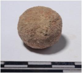 | Description / विवरण | A sand stone sling ball, circular in section and rough surface. |