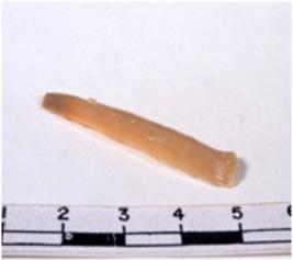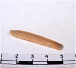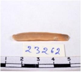 | Description / विवरण | A fragment of a rectangular shaped chert blade showing dorsal sides with sharp cutting edges having smooth surface and triangular section. |