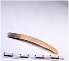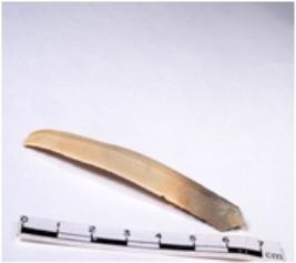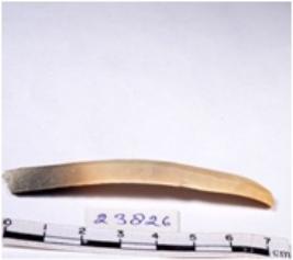 | Description / विवरण | A fragment of a rectangular shaped chert blade showing dorsal sides with sharp cutting edges having smooth surface and triangular section. |