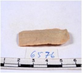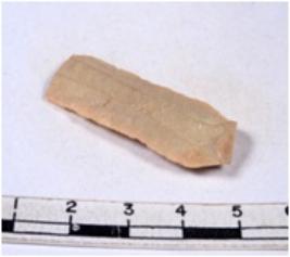 | Description / विवरण | A fragment of a rectangular shaped chert blade showing dorsal sides with sharp cutting edges having smooth surface and triangular section. |