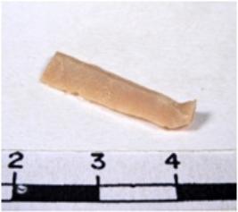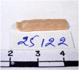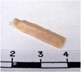 | Description / विवरण | A fragment of a rectangular shaped chert blade showing dorsal sides with sharp cutting edges having smooth surface and triangular section. |