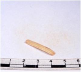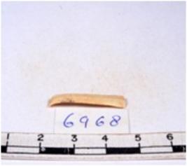 | Description / विवरण | A fragment of a rectangular shaped chert blade showing dorsal sides with sharp cutting edges having smooth surface and triangular section. |